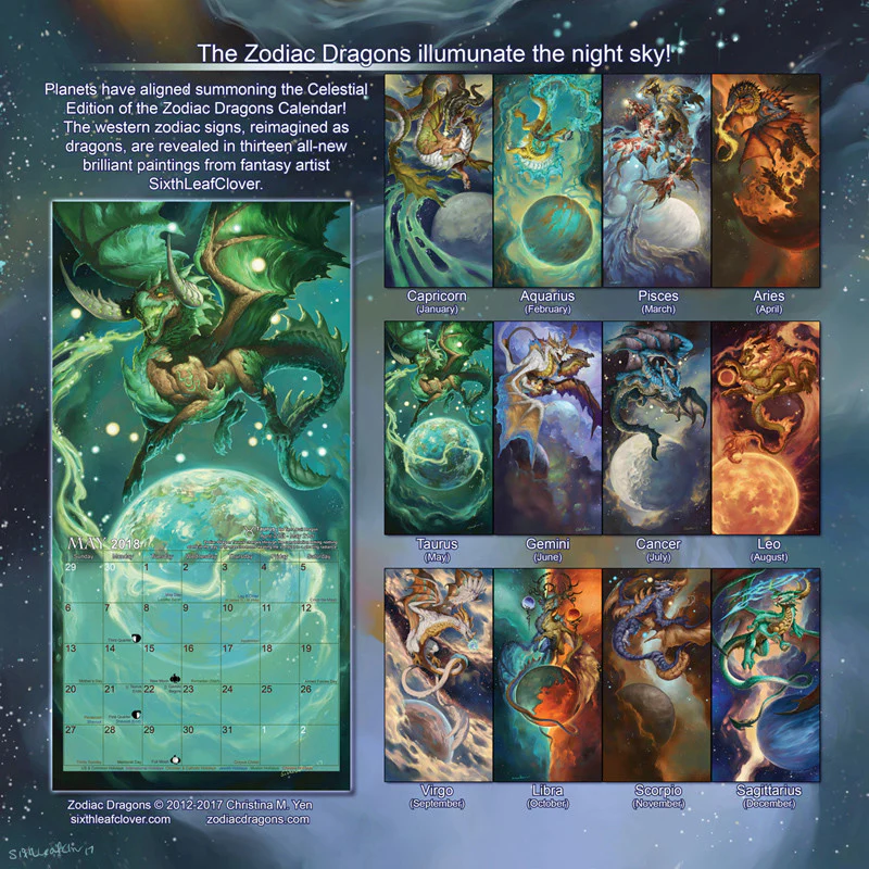 The 2018 Celestial Edition of the Zodiac Dragons® Calendar by SixthLeafClover® is almost here! The night sky becomes illuminated with the constellation of the Zodiac Dragons®!