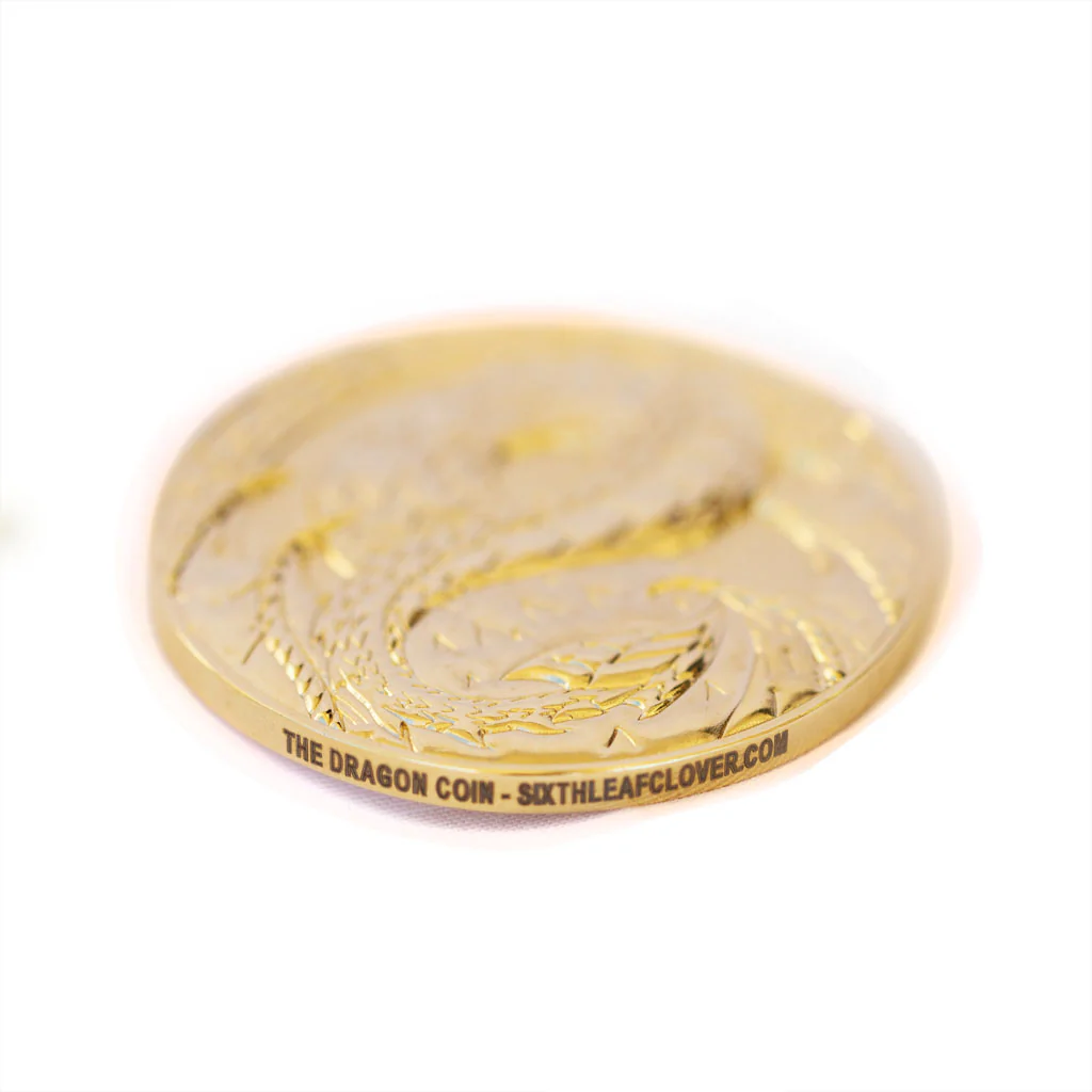 The coin features dragon “heads” and “tails” with intricate 3D details on each side. The edge has laser engraving. It is colored to look like gold.
